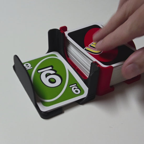 Uno deck box that transforms into two card trays for draw and discard. Makes storage a breeze and keeps your cards organized during play. The two halves slide together, connecting to one another and perfect for games using narrow cards and larger card counts (ex. UNO, Skip-Bo, Dos, Monopoly Deal, Ticket to Ride European).